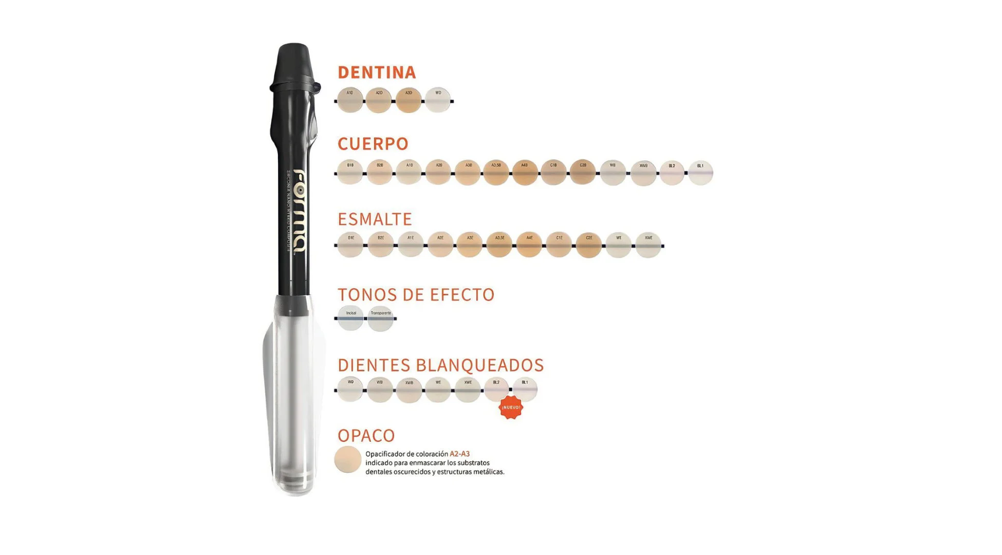 - Dientes Anteriores – FORMA: posee el equilibrio ideal de translucidez entre esmalte y dentina, ofreciendo con eficiencia y de manera sencilla resultados estéticos similares a largos procedimientos de estratificación.